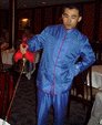 お湯つぎ男 ハーブティーのお湯は何杯でもおかわりができます。 1 m くらいの注ぎ口のついたポットから注ぎますが、 遠くから茶碗めがけて発射するところは見物です。 お湯つぎ男はとても気取っています。 |